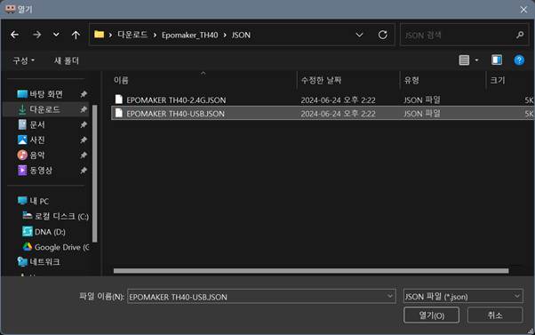 파일 선택화면이 나오면 1번에서 받았던 파일이 있는 경로로 이동합니다. JSON 파일이 보이고 지금 연결되어 있는 TH40 연결방식에 맞는 파일을 선택합니다.
