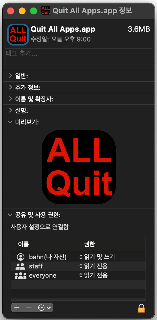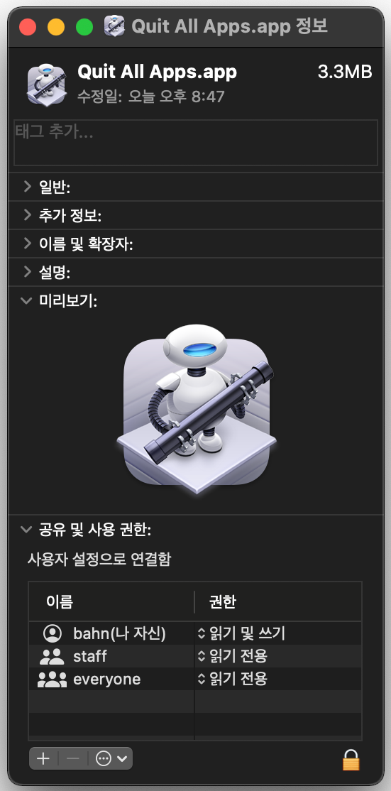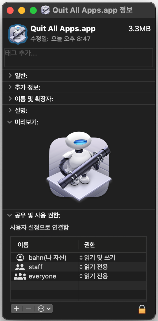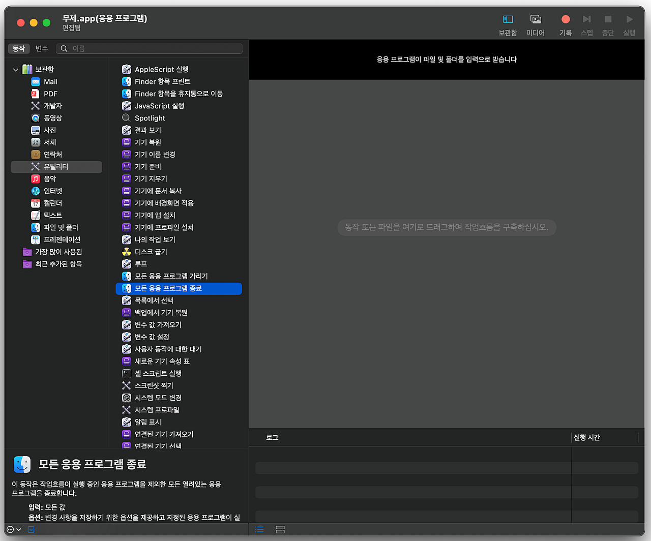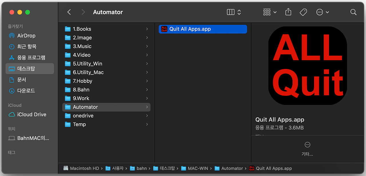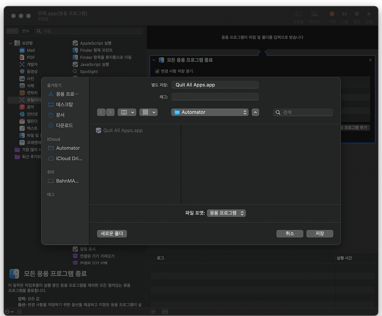참고로 저는 데스크탑(바탕화면)에 automator 폴더를 만들고 그곳에 Quit All Apps.app 로 저장했습니다.