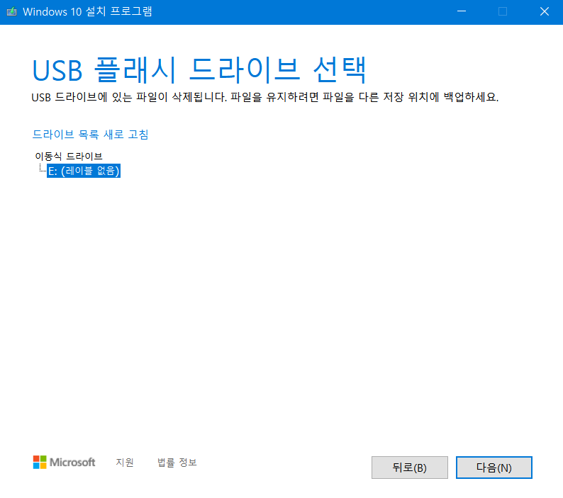 - 2번에서 PC에 연결한 USB 메모리를 선택하고 다음을 클릭합니다.