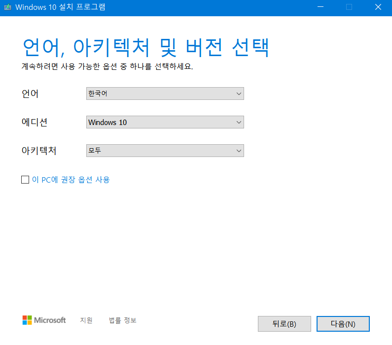 - '이 PC에 권장 옵션 사용'을 해제하고 아키텍처에서 32bit/64bit/모두 중에 원하는 것을 선택합니다.
