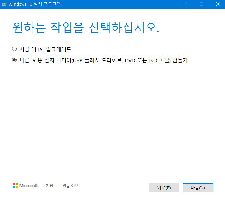 - 원하는 작업 선택에서 '다른 PC용 설치 미디어 만들기' 를 선택합니다.