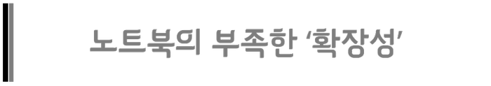 노트북은 간편한 이동성, 사용공간의 최소성으로 데스크탑 대비 절대적인 강점을 가지고 있지만 다른 한편으론 성능, 화면크기, 배터리, 무게 등에 대한 아쉬움도 있습니다.