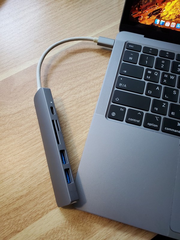 기존에 사용하던 USB 허브 연결 모습입니다. 여기에 모니터, 키보드/마우스, USB 메모리, 외장디스크를 연결하면 장난아닙니다. 또 외부 이동시에는 모두 연결 해제 하고 USB 허브를 백북 에어와 같이 가지고 다닙니다. 번거롭죠…..