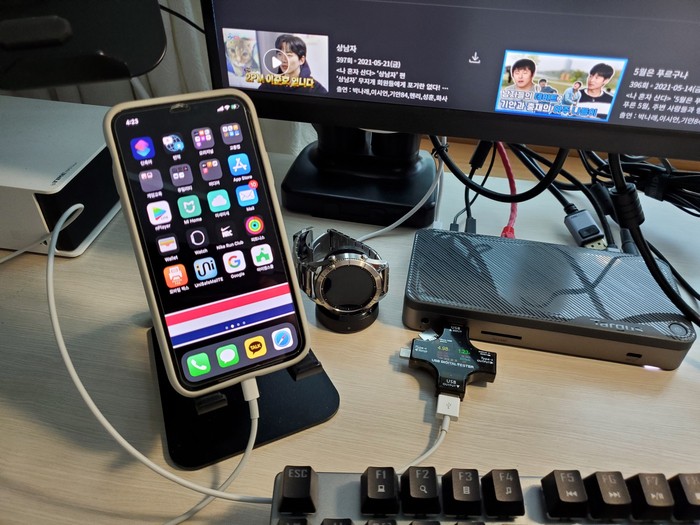 - 허브처럼 키보드, 마우스를 연결하고 스마트워치 dock도 상시 연결해서 충전과 더불어 아주 잘 작동하였습니다.