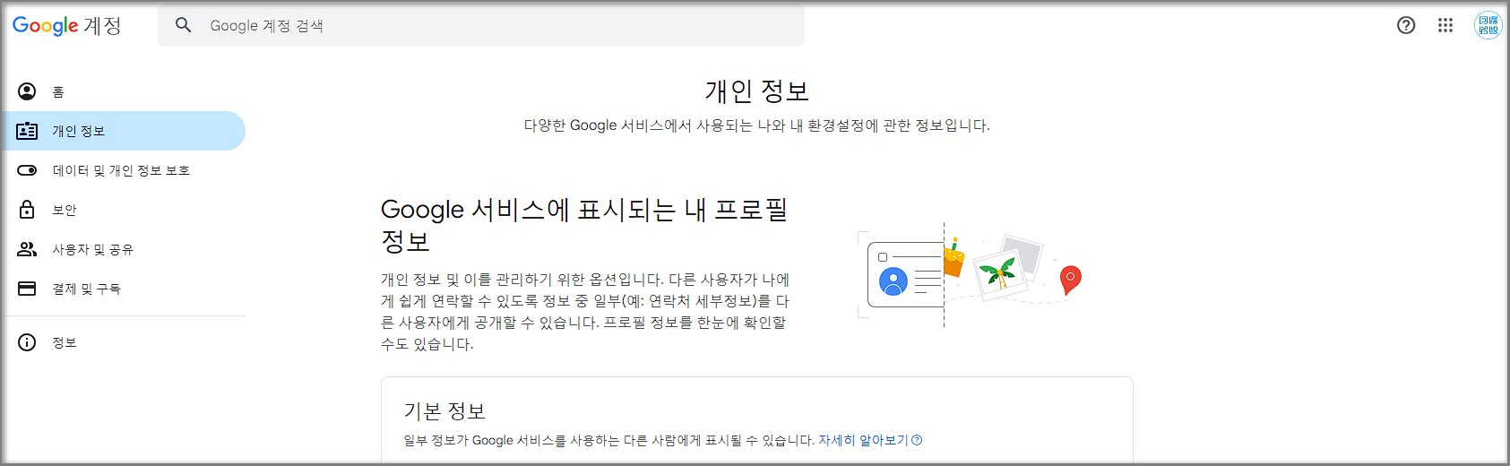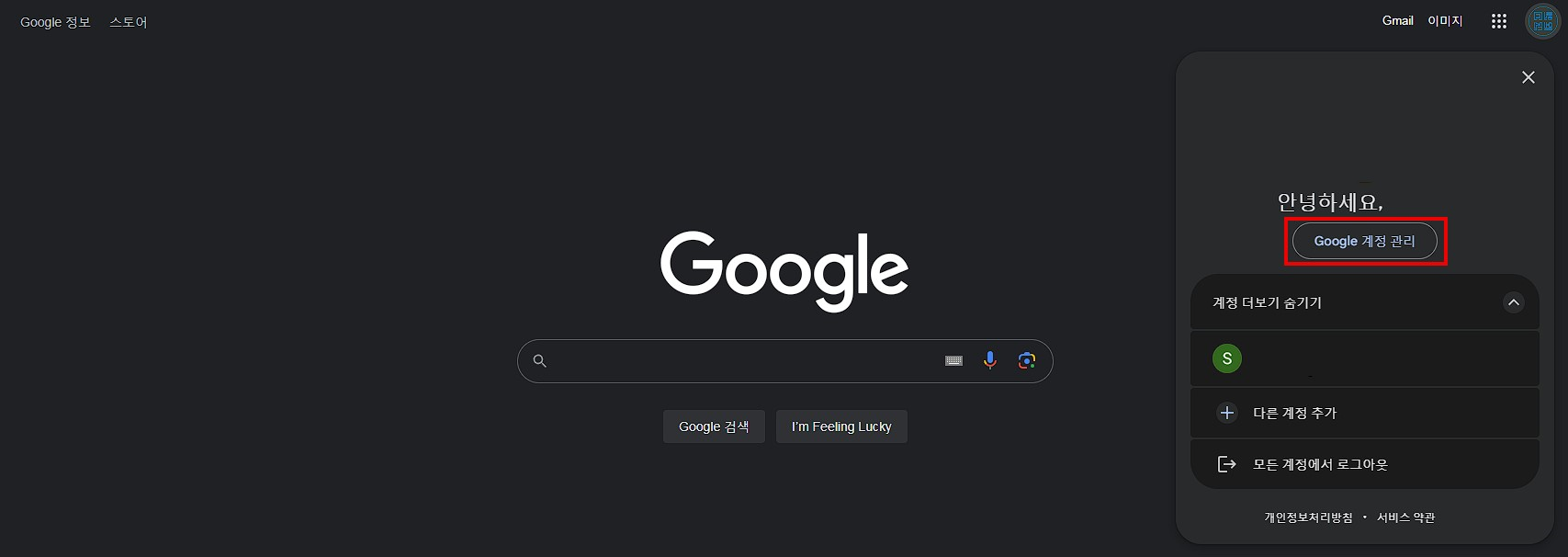 2. 오른쪽 위의 계정을 클릭하고 팝업창의 'Google 계정관리' 를 클릭합니다.