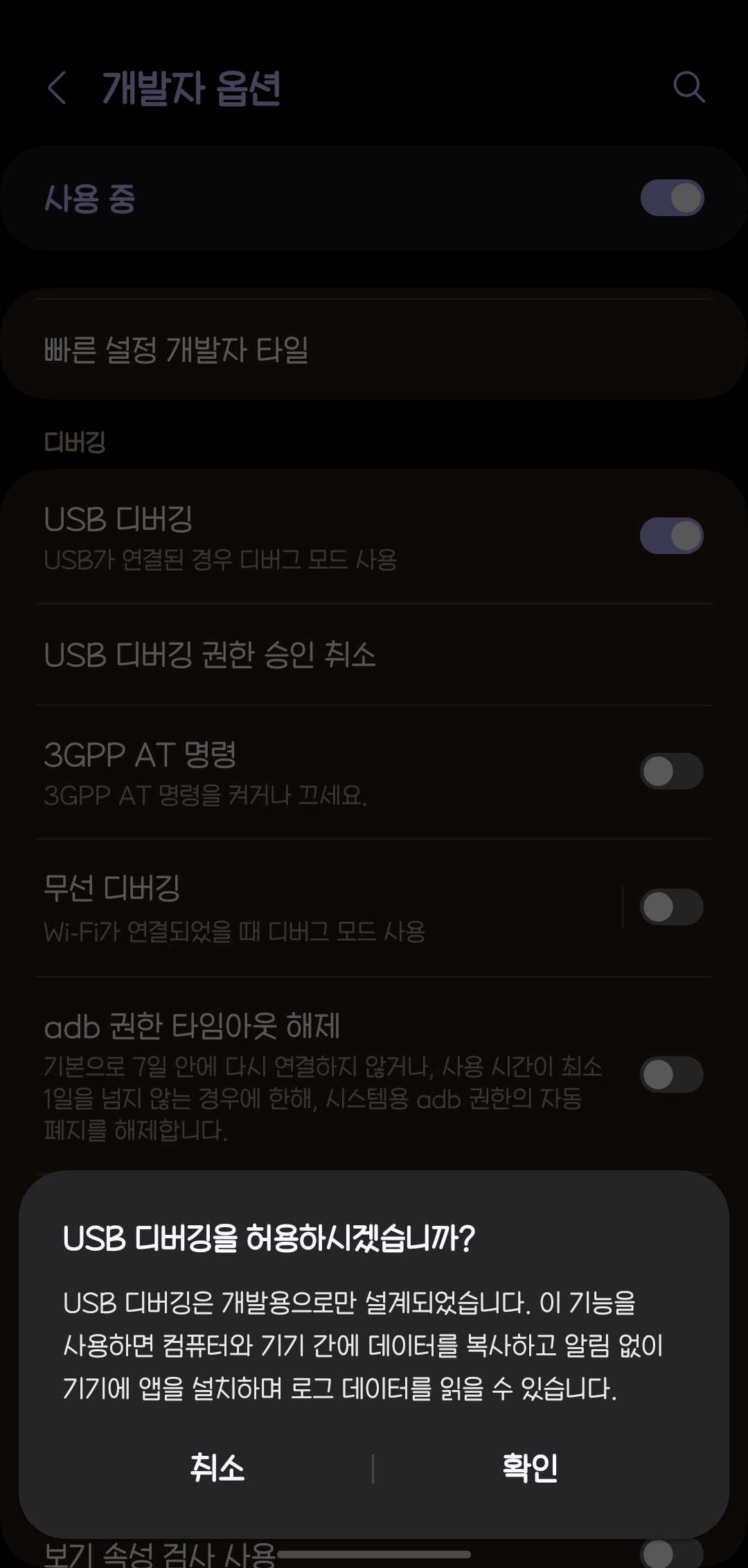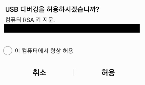 스마트폰에서 USB 디버깅을 허용하시겠습니까? 라는 창이 뜨면 허용을 클릭한다