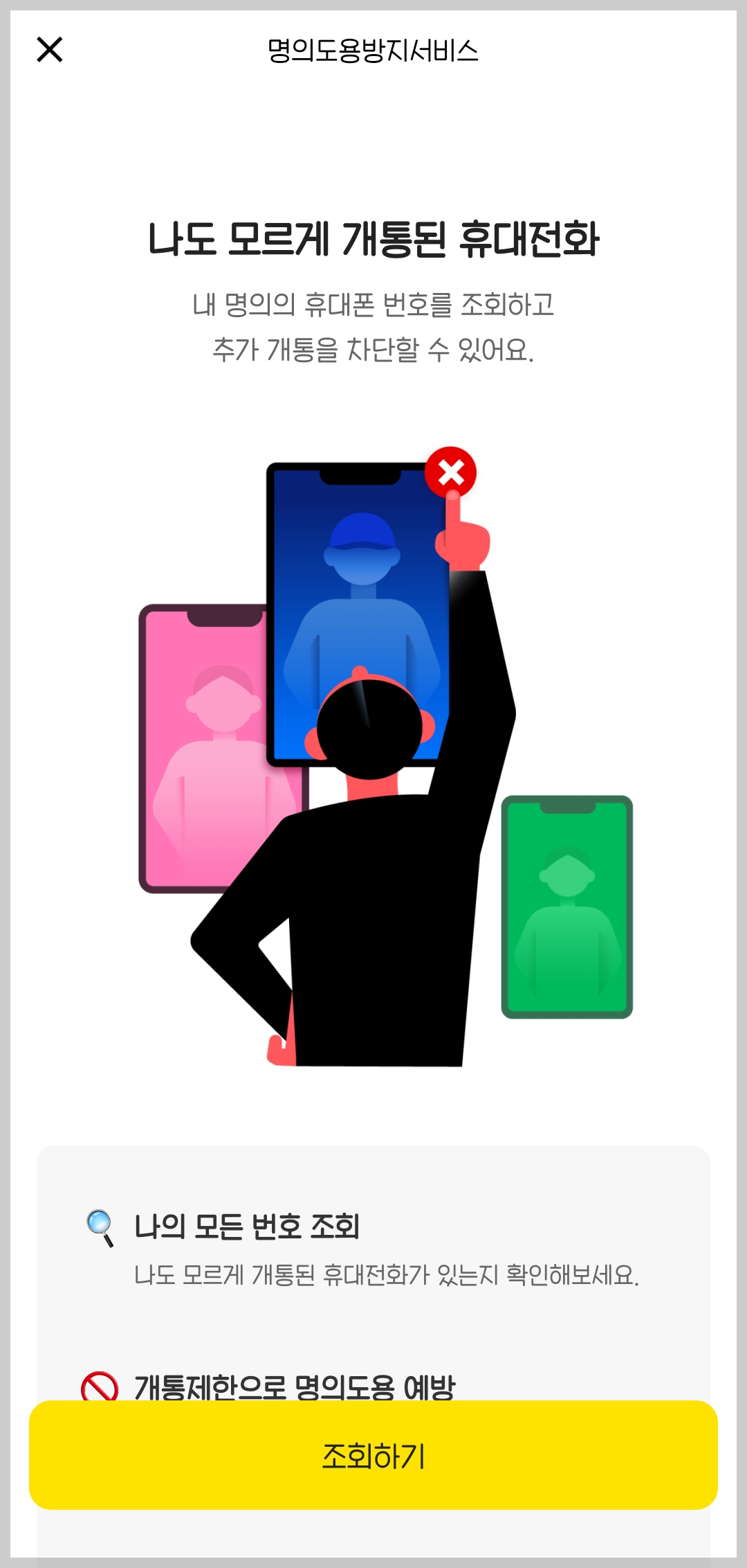 간단하게 내 명의로 개통된 전화(통신사, 전화번호)를 확인할 수 있고, 각 통신사의 개통을 차단과 허용을 설정할 수 있는 방법입니다.