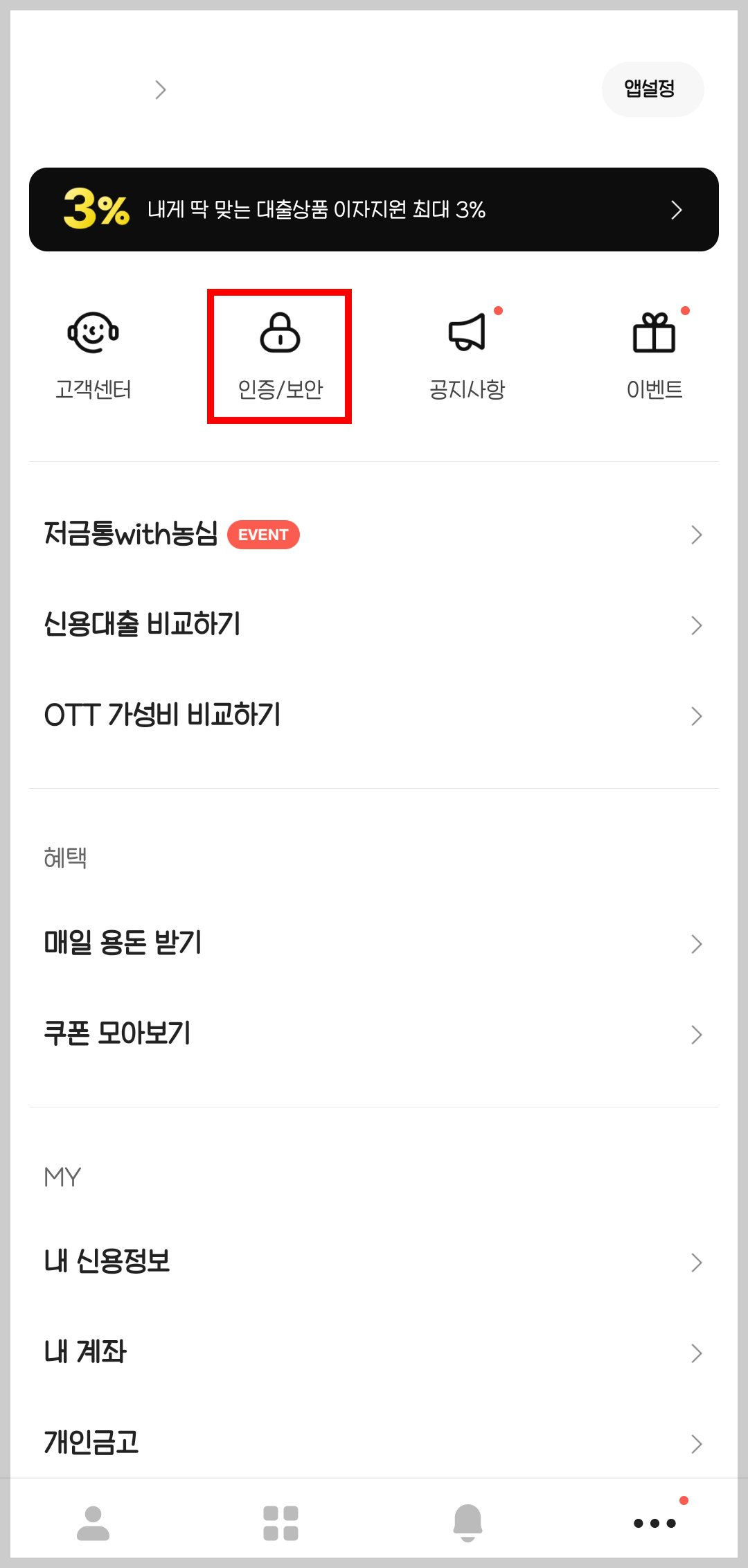- 카카오뱅크 화면에서 오른쪽 하단의 점3개 아이콘을 클릭합니다.