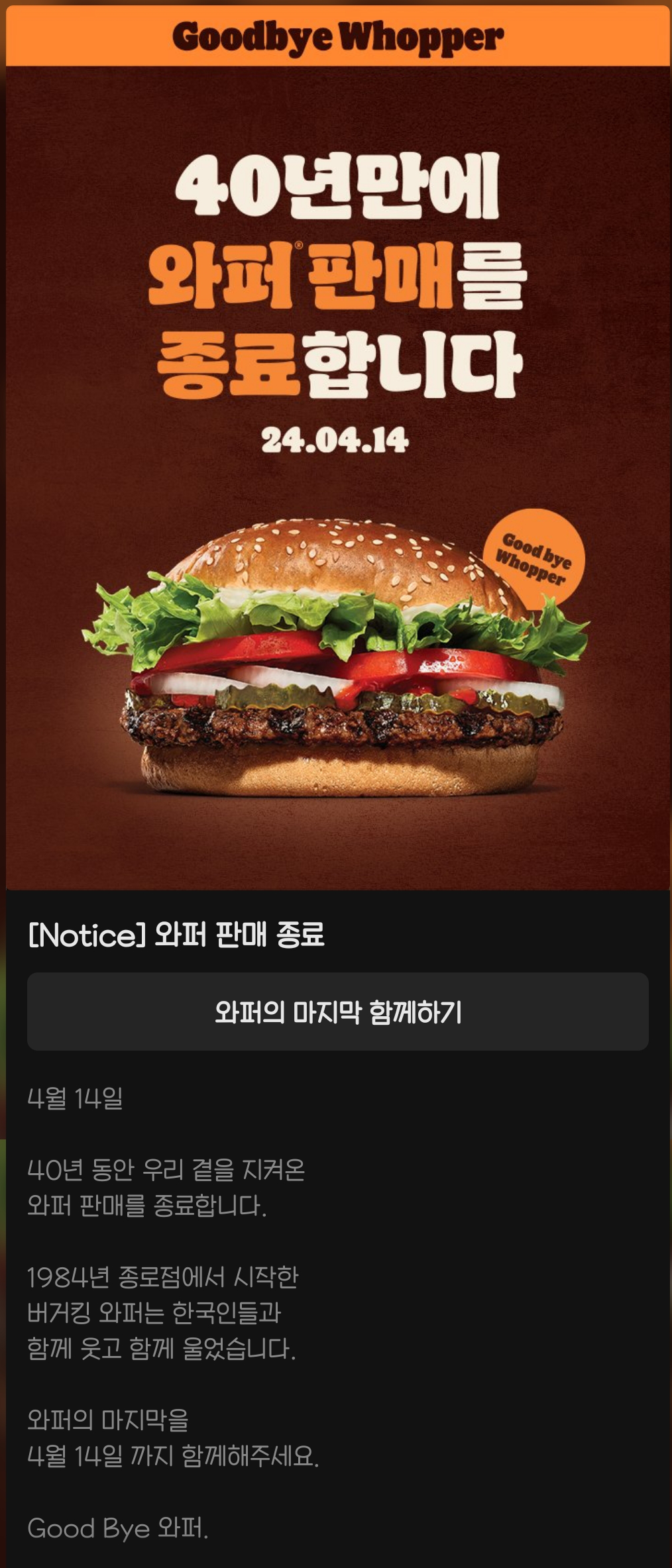 어그로 마케팅인가? 아니면 진짜 와퍼 판매 종료하고 새로운 네임의 버거를 출시하려고 하는가? 그런데 버거킹이 글로벌 업체인데 진짜 와퍼 종료라면 해외에서도 화제가 됐을 텐데 국내에서만 공지한다?
