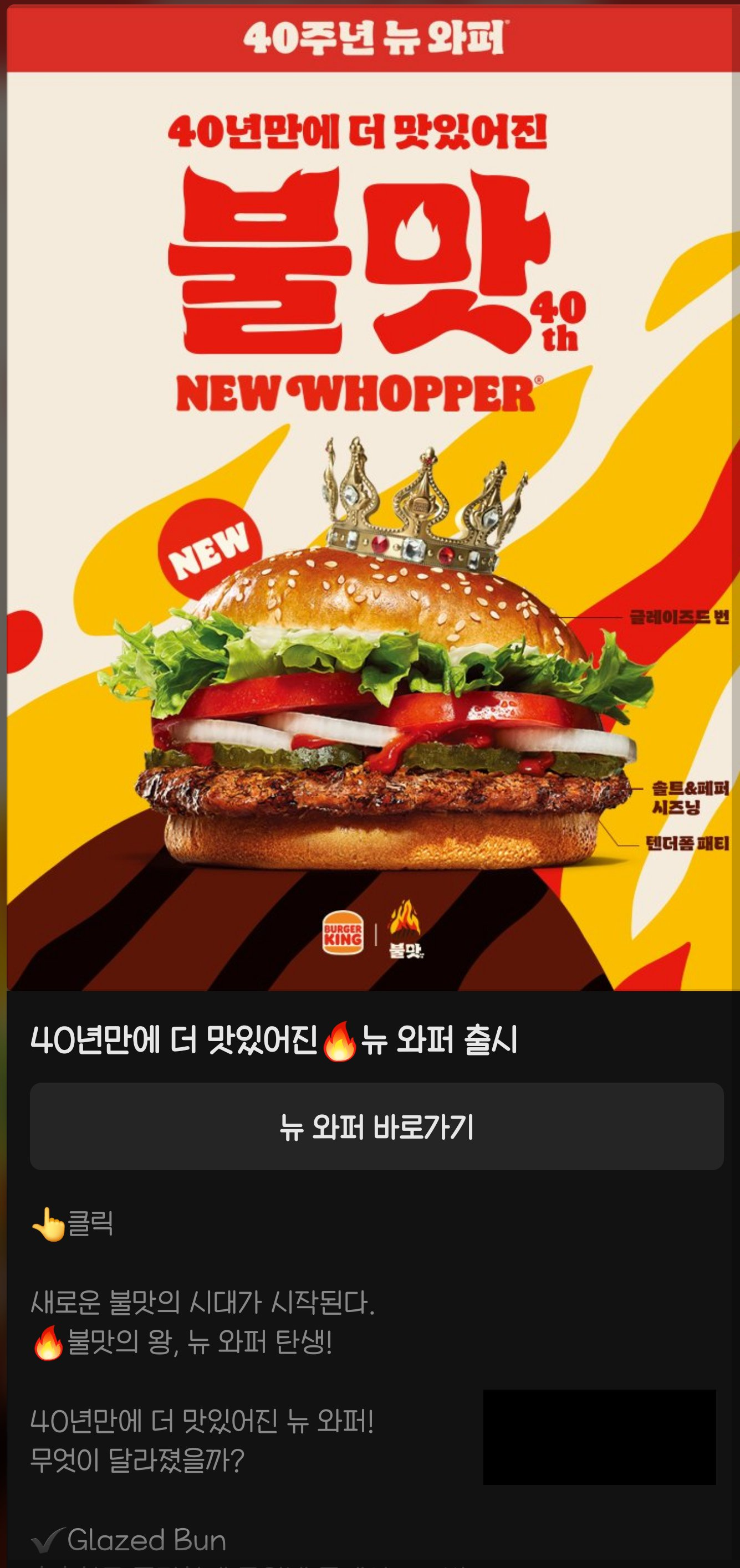 문구를 보면 뉴 와퍼의 기존 와퍼와의 차이점은 불맛이네요. 불맛 !!!
