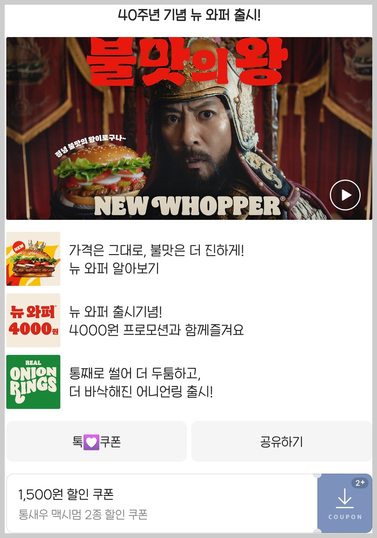 카톡으로 버거킹 메세지가 왔습니다. 역시나 뉴(New) 만 앞에 붙여서 발표했습니다.