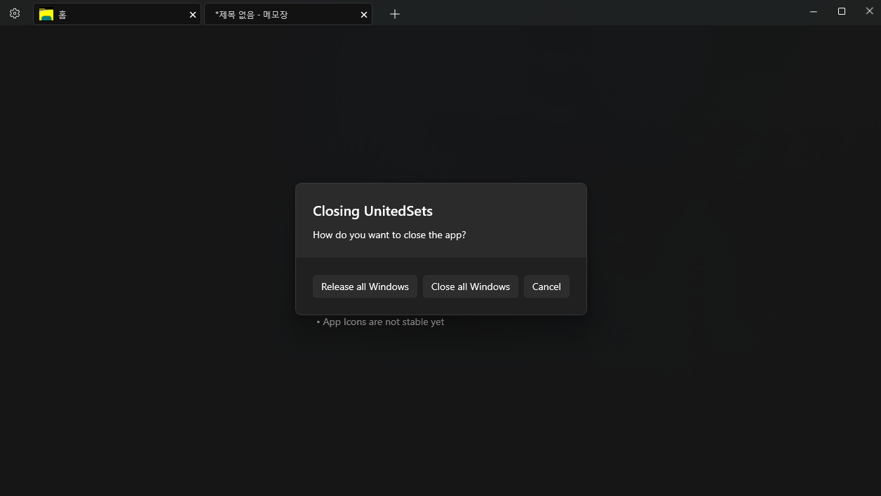 Clos All Windows : 'united sets preview beta' 를 종료하고 그룹핑되어 있던 윈도우 창도 종료됨