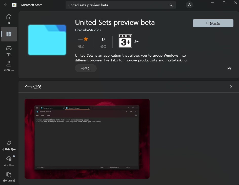 가) MS Store를 실행하고 united sets preview beta 를 검색합니다.