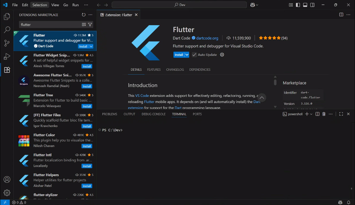 Flutter 확장을 설치하면 Dart 확장도 자동으로 설치됩니다.