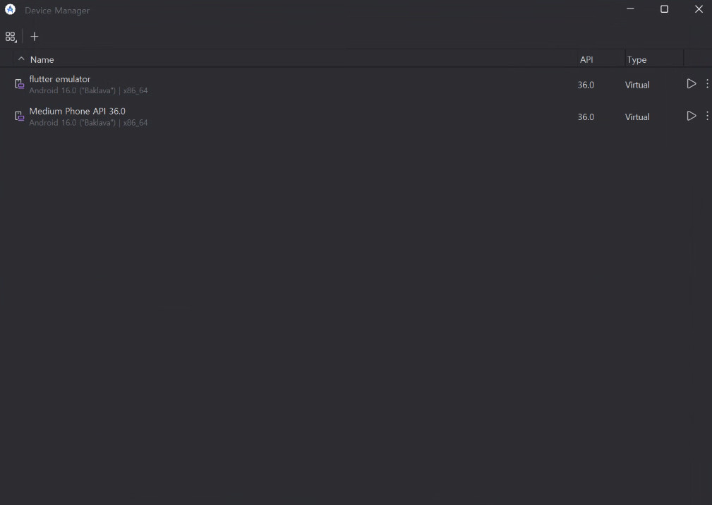 2) AVD 실행: Device Manager 목록에서 새로 생성된 디바이스를 확인(flutter emulator)하고, 오른쪽에 있는 시작 아이콘을 클릭해 AVD가 잘 실행되는지 확인합니다.