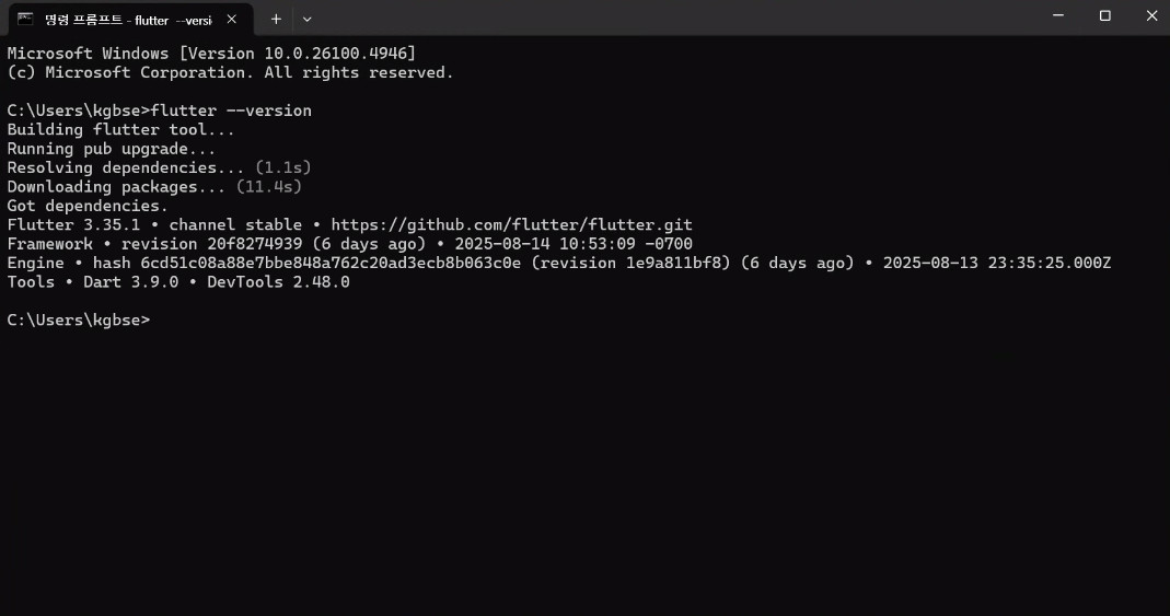 5) 설치 확인: 새로운 터미널(PowerShell 또는 명령 프롬프트)을 열고 아래 명령어를 입력하여 Flutter가 제대로 설치되었는지 확인합니다.