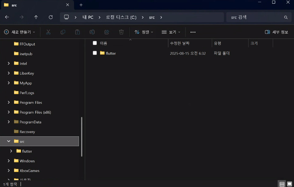 3) 다운로드한 SDK 압축 파일의 압축을 해제하고 flutter 폴더를 C:\src로 옮깁니다. 이제 C:\src\flutter 구조가 되었는지 확인하세요.