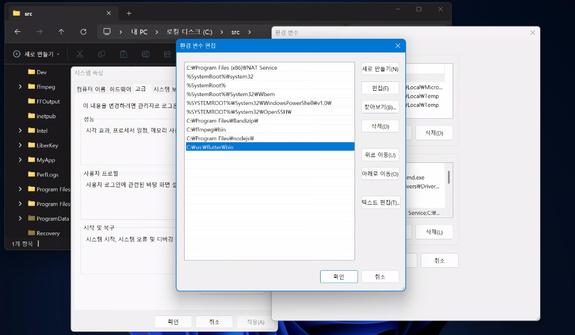 (사용자 변수 또는 시스템 변수) Path 편집 → 새로 만들기 → C:\src\flutter\bin 추가 → 확인